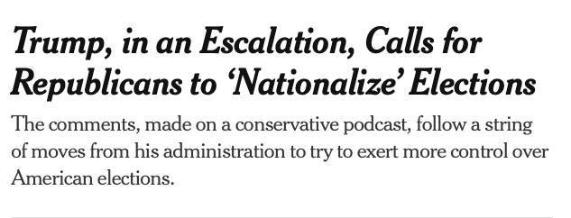 Mr. Trump has made little secret of his interest in expanding the federal government’s role in administering American elections. Last month, he told The Times that he regretted not dispatching the National Guard to seize voting machinery after the 2020 election.