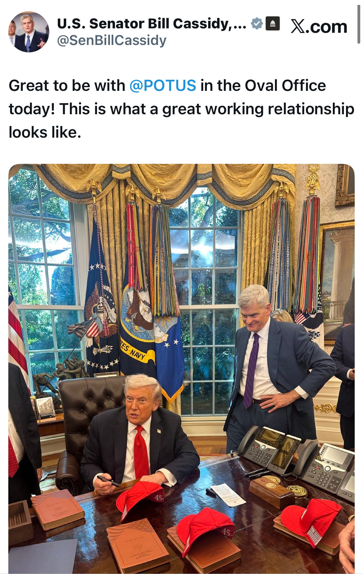Because when else did Cassidy “waver?” I mean, yes, sure, he voted to impeach. And yes, after Trump was indicted for mishandling classified documents, he called for him to drop out of the 2024 election (because obviously). BUT he also confirmed RFK as Health Secretary, despite his background as a physician and his lifelong advocacy for vaccines. He was also the 50th vote for Secretary of War Pete Hegseth, a deciding vote that paved the way for VP Vance to cast the tie-breaking vote. And up until Trump’s endorsement of Letlow, this was the post pinned to the top of his Twitter feed:
